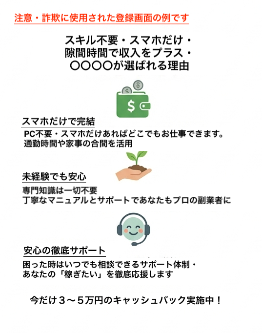 - 「スマホだけで簡単に稼げる」「副業で稼げる」「スキル不要」といった案内